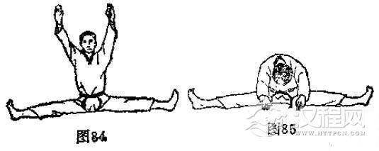 见(图80-图83)的动作。两腿仲直并拢,下压时两膝不许弯屈。