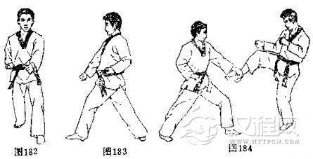 把拳置于下腹处以防对方的下段攻,抬拳时手背向外,放下时拳背向上基本和地面平行。使用部位是手腕的外侧,见(图182一正面),(图183一侧面),及实际用法(图一184)。