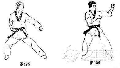 身体侧向对方,用腕侧或前臂去扫开对方进攻,(图185)是防下段的动作,(图186〕是防中段的动作。
