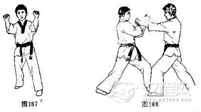 伸出双臂,同时防守对方的进攻(图181),一般是从中间向两侧分开格挡(图188)。