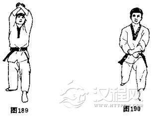 双手交叉,架防对方对我上段的踢攻(图189),或防下段(图190).
