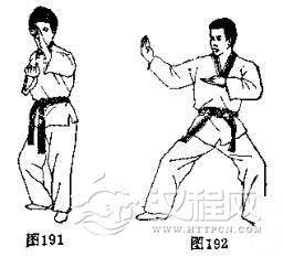 双手呈手刀,从内侧向外侧去防对方的进攻。见(图191一正面),和(图192-侧面)。
