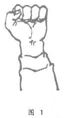 五指卷屈握紧,拳面要平,拇指压于食指和中指的第二指节上,任何指骨都不得凸出拳面(图1)。
