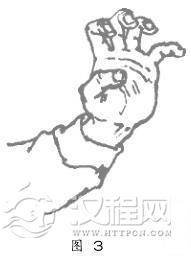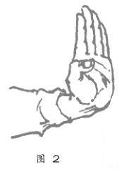 五指用力张开,第二、三节指骨弯曲,第一节指骨尽量向手背的一面伸张,使掌心凸(出图3)。