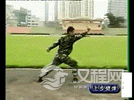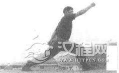 右脚向前上步成右弓步,左拳变八字掌前伸,右拳自然后摆,左转身成马步的同时,右拳经右向上向左向下猛劈,拳心向上,左手抓握右手腕,左掌心向上,两大臂夹紧,小臂略平,右拳想右向上方猛力反弹,力达拳背,拳与头同高,同时左手变拳自然后摆,成右弓步。