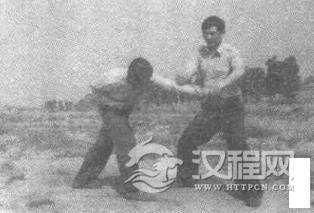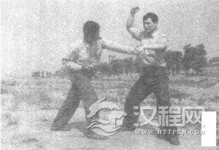 实用技法:敌左拳攻我上盘,我面右闪身躲过,左手顺势撩拿敌腕(并向左侧拉),动作不停,左转体成马步同时以右拳劈击敌肘关节(图2一113a,2一133b)