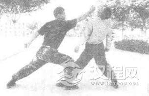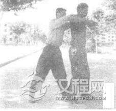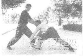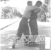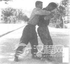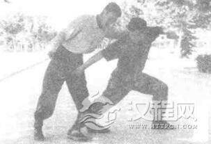 实用技法:敌从后侧合抱,欲将我摔到。我上体前倾,控制重心(图2-118),趁敌不备,我突起右脚,以足跟猛踏敌足背(图2一119),乘势双臂撑开敌双臂(图2一120),接着.我左脚前移成左弓步,右手勾击敌档部(图2一121)