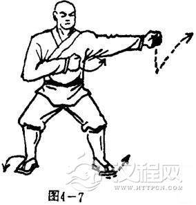 右脚在前方震脚下落,左脚前上一步,两脚为轴,体右转90度,两腿成马步,同时,右拳向右侧猛力崩击,拳心向前,拳眼向上,左臂屈肘左拳挑于左前侧方,拳心向前,拳眼向右.目视左拳(图4-5).