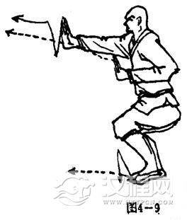 右脚前上一步,左脚为轴体左转180度,右脚震脚下落,与左脚成步,两腿屈膝半蹲,间时,右掌随势推向正前方,掌高与鼻平齐.掌心向前,掌指向上,左掌随势外撩,屈肘收护于胸前左侧,掌心向前,掌指向上.目视前方(图4-9) .
