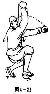 双脚离地跳起,体左转90度,两腿前后换步下落,屈膝成左跪步,同时左拳向上、向后环弧,直臂向前下方猛冲,拳心向右,拳眼向上,右拳架于头前上方,拳心向左,拳眼向后。目视左拳(图4一21).