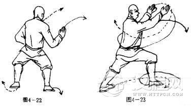 起身,两脚为轴体左转90度,两腿成马步,同时两拳迅速变掌,由上向下封拍,掌心斜向下,掌指斜向前.目视右前侧(图4一22).上动不停,两脚眼地,体右转90度,两腿成右弓步,同时两掌由下向上向左前侧猛推,两掌心斜向左,掌指斜向上.目视前方(图4一23).