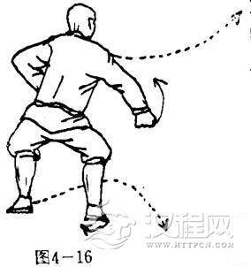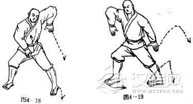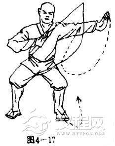 抬左脚向前挑击,再向后勾挂,落地成右弓步,同时,左掌由上向下,再向上提,屈肘护于左肋外侧,掌心斜向后,掌指向下,右掌由上向下沿左肩臂向下抹切,护于裆前,掌心向内,掌指向下.目视左下侧(图4一18).