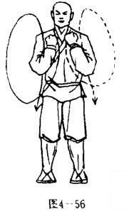 两脚蹍地,体右转90度,两脚八字步站立,上体正直;同时两臂屈肘、两掌变拳向胸前搂击,两拳心向内,拳眼斜向上。目视前方(图4一56).
