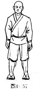 两足八字步站立;上体正直,两拳变掌,向下环弧上返,再下落于两胯外侧,掌心向内,掌指向下。目视前方(图4一57).