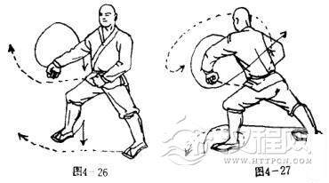 抬左脚、回身震脚,体左转225度,右脚前上一步落地,两腿成右弓步,同时,左拳随势外拨,屈肘护于腰间左侧,拳心向内,拳眼向上,右拳随势向右前侧挎击,拳心向内;拳眼向外.目视前方(图4一26).