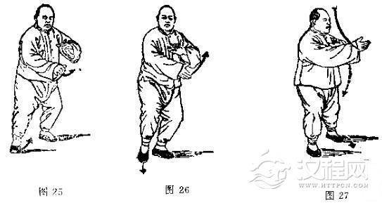 动作二、三与前第五式“提手上势”动作二、三相同。 (接图25-27)