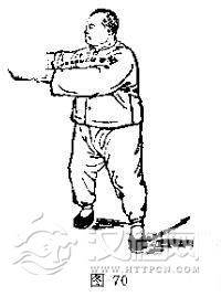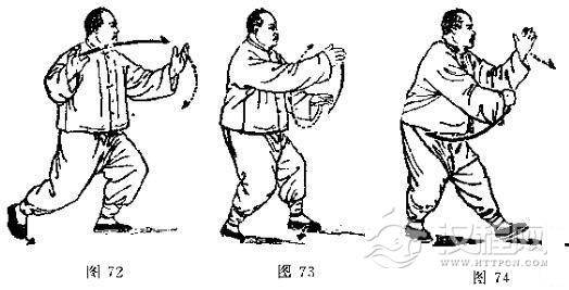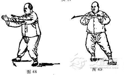 动作一、二同第四式“单鞭”动作一、二(图18-20),惟方向正斜不同。(图68-70)
