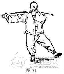 动作三:重心全部移于右腿,身体微左转,左脚提起向左后(正东)方摆出。随转体,左掌向左弧 形平移,随移随着臂外旋使掌心翻朝里;右掌也紧跟着向左弧形平移,随移随着臂外旋使掌心翻朝前;两肘稍沉、微屈,使 两掌心遥对。眼神关及左掌左移。(图71)