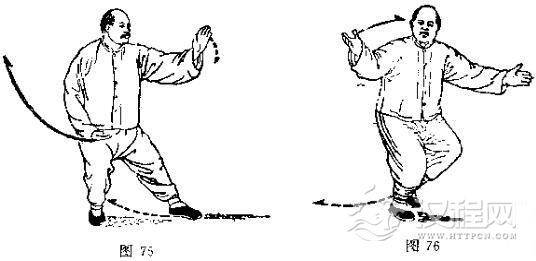 动作二:重心渐渐全部移于右腿,左脚经右踝内侧提起;身体继续向右微转;同时,右掌向后稍 偏右弧形举至与肩齐,左臂外旋使掌心渐渐翻朝上;眼神关顾右掌后举。(图76)