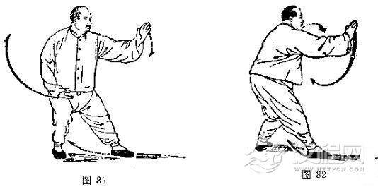 2.当一掌后抽时,须经胯旁,初学者往往做成经肋旁,那样手臂就成直角而不成弧形,就显得 不宽舒和别扭。