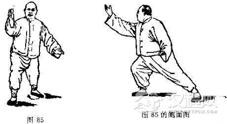 动作二:身体右转;同时右脚向右后(南稍偏西)方迈出一步,先以脚跟着地,随着重心渐渐移向右腿而至全脚踏实,弓右腿 ,蹬左腿,成右弓步。随转体,右掌以大拇指一侧向右后上方(扌列)出,高与额齐;左掌向左弧形下采,高与胯齐,掌心朝下。左脚尖随右手例出向里扣。眼随转体平视转移,眼神要关及右掌例出。(图84-85, 附图85的侧面图)