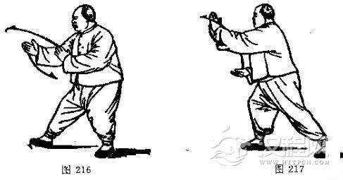 动作三:右脚向前(稍偏右)落下,先以脚跟着地,随着重心移向右腿,渐至全脚踏实,弓右腿, 蹬左腿,左脚尖微里扣,成右弓步;身体继续右转。同时,右拳变掌继续随转体向前弧形下撇至右腰前,掌心朝上,左掌弧形收至 胸前经右小臂里侧上方向前推出;眼向前平视。并要关及左掌前推。(接图216-217)