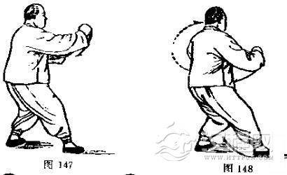 动作一:重心渐渐移于左腿,身体渐渐左转。同时,左拳变掌随转体向左后捋,随掘随着臂外旋 使掌心翻朝上;右拳向前弧形下落于左掌前上方,随下落随着臂外旋使拳心翻朝左面里侧(右拳高与肩齐),随左掌左搌。 (接图147- 148)