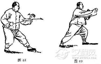 动作三、四、五与第十二式“进步搬拦捶”动作三、四、五相同。(接图46-49)