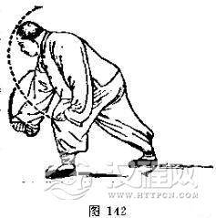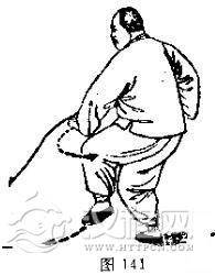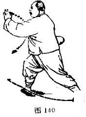 动作一:右脚尖外撇踏实,身体渐渐右转,重心随着渐渐移于右腿,左脚(脚跟先离地)向前提起 ;同时,左掌随转体自前向右弧形下搂,右掌自右胯侧向右向后向前(变拳)划弧置于右.腰侧;眼神关顾左掌下搂。(图140 -141)