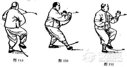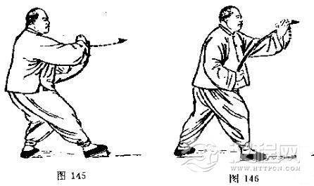 动作二、三与第二十四式“撇身捶”动作二、三相同,惟方向相反。(图144-146)