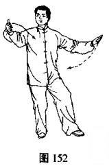 (1)上体微向右转,同时右手随转体向后上方划弧平举,手心向上,左手放松,手心向下,目视左手(图152)