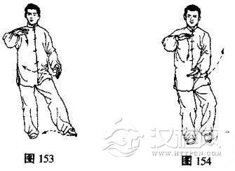 (2)身体继续向右转,左手自然下落逐渐翻掌经腹前划弧至右肋前,手心向上,右臂屈肘.手心转向下,收至右胸前,两手相对成抱球状,同时身体重心落在右腿上,左脚收到右脚内侧,脚尖点地,目视右手(图153, 154)
