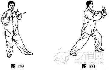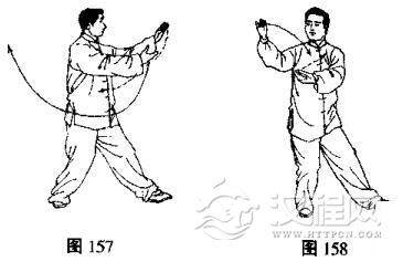 (4)身体微向左转,左手随即前伸,翻掌向下,右手翻掌向上,经腹前向上、向前伸至左前臂’下方,然后两手下抨,即上体向右转,两手经腹前向右后上方划弧,直至右手手心向上,高与肩齐,左臂平屈于胸前,手心向后,同时身体重心移至右腿,目视右手(图一157, 158)