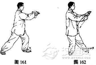 (5)上体微向左转,右臂屈肘折回,右手附于左手腕里侧(相距约5厘米)。上体继续向左转,双手同时向前慢慢挤出,左手心向右,右手心向前,左前臂保持半圆,同时身体重心逐渐前移变成左弓步,目视左手腕部(图159, 160)
