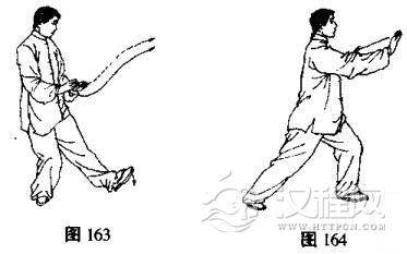 (7)上势不停,身体重心慢慢前移,同时两手向前、向上按出,掌心向前,左腿前弓成左弓步(图164)。