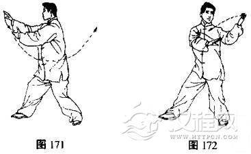 (3)同“左揽雀尾”(4)动作,只是左右方向相反(图171, 172)