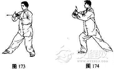 (4)同“左揽雀尾”(5)动作,只是左右方向相反(图173, 174)