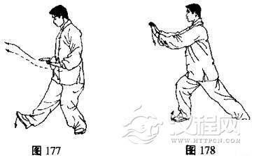 (6)同“左揽雀尾”(7)动作,只是左右方向相反(图178)