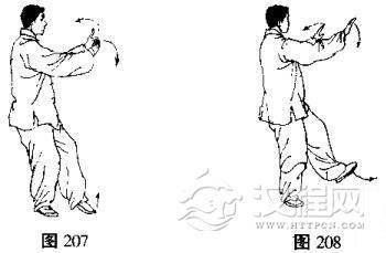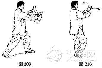 (1)左手手心向上,前伸至右腕背面,两手相互交叉,随即向两侧分开并向下划弧,手心斜向下,同时右脚提起向左前侧方进步(脚尖略外撇),身体重心前移,右腿自然蹬直,成左弓步,目视前方(图207、208、209)。