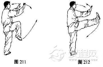 (3)两臂左右划弧分开平举,肘部微屈,手心均向外,同时右腿屈膝提起,右脚向右前方慢慢蹬出,目视右手(图211, 212)