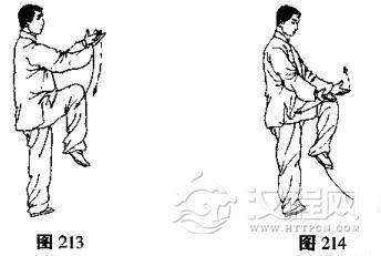 (1)右腿收回,屈膝平举,左手由后向上、向前下落至体前,两手心均翻转向上,两手同时向下划弧分落于右膝两侧,目视前方(图213, 214)