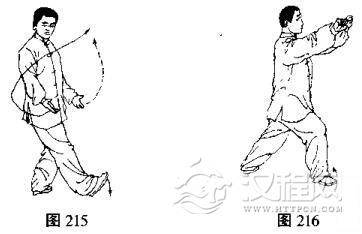 (2)右脚向右前方下落,身体重心渐渐前移,成右弓步,面向右前方,同时两手下落,慢慢变拳,分别从两侧向上、向前划弧至面部前方,两拳相对,高与耳齐,拳眼都斜向内下(两拳间距约10一20厘米),目视右拳(图215, 216)
