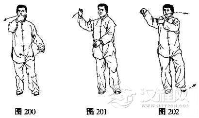 (1)上体向右转,右手随之向右运转至右侧方时变成勾手,左手经腹前向右上划弧至右肩前,手心向内,身体重心落在右腿上,左脚尖点地,目视左手(图200, 201, 202)