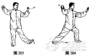 (2)上体微向左转,左脚向左前侧方迈出,右脚跟后蹬,成左弓步,在身体重心移向左腿的同时,上体继续左转,左掌慢慢翻转向前推出,成“单鞭”(图203、204)。