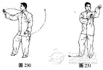 (1)右腿下落于左脚前,脚掌着地,然后左脚前掌为轴,脚跟内转,上体随之左转,同时左一手向后平举变成勾手,右掌随着转体向左侧划弧,立于左肩前,掌心斜向后,目视左手(图230, 231).