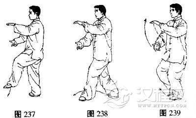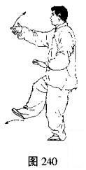 (2)身体右转,右脚向右前方迈出,屈膝弓腿,成右弓步,同时右手由脸前向上举起内旋翻掌停在右额前,手心斜向上,左手先向左下再经体前推出,高与鼻尖平,手心向前,目视左手(图240,241、242)。