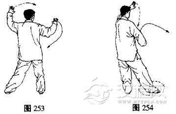 (1)上体后坐,重心移至右腿,左脚尖里扣,身体向右后转,然后身体重心再移至左腿上;与此同时,右手随转体向右、向下(变拳)经腹前划弧至左肋旁,拳心向下,左掌上举于头前,掌心斜向上.目视前方(图253、254)。