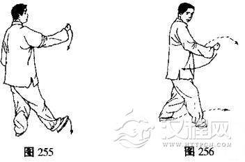 (2)向右转体,右拳经胸前向前翻转撇出,拳心向上,左手落于左胯旁,掌心向下,指尖向前,同时右脚收回后再向前迈出,脚跟着地,脚尖外撇,目视右拳(图255、256)。
