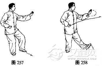(3)重心移至右腿,左脚向前迈一步,同时左手上起经左侧向前划弧拦出,掌心向前下方,右拳内旋向右划弧收到右腰旁,拳心向上,目视左手(图257、258)。