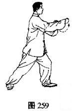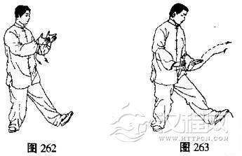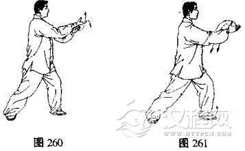 (1)左手由右腕下向前伸出,右拳变掌,两手手心逐渐翻转向上并慢慢分开回收,同时身体后坐,左脚尖翘起,重心移至右腿,目视前方(图260,261、262)。